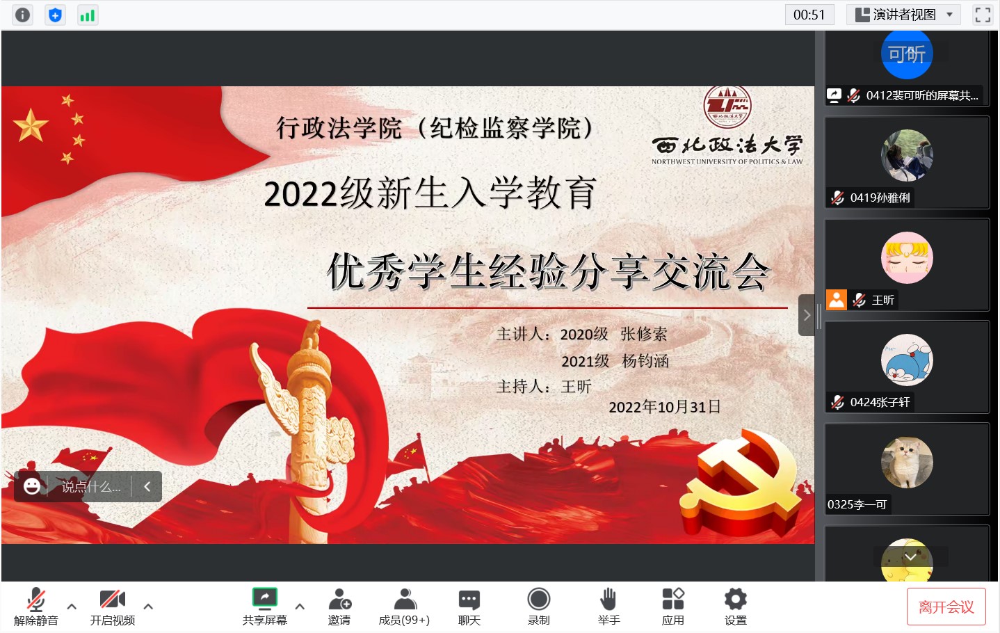 为了营造良好的学习氛围,增强2022级新同学们的学习信心和动力,解决新生自入学以来对于部分学科学习的困惑,并进一步彰显榜样力量。10月31日晚,成人抖音 (纪检监察成人抖音 )在线上举办优秀学生分享交流会。此次分享会邀请2020级张修索同学和2021级杨钧涵同学主讲,2022级新生辅导员王昕主持,成人抖音 全体新生参加。