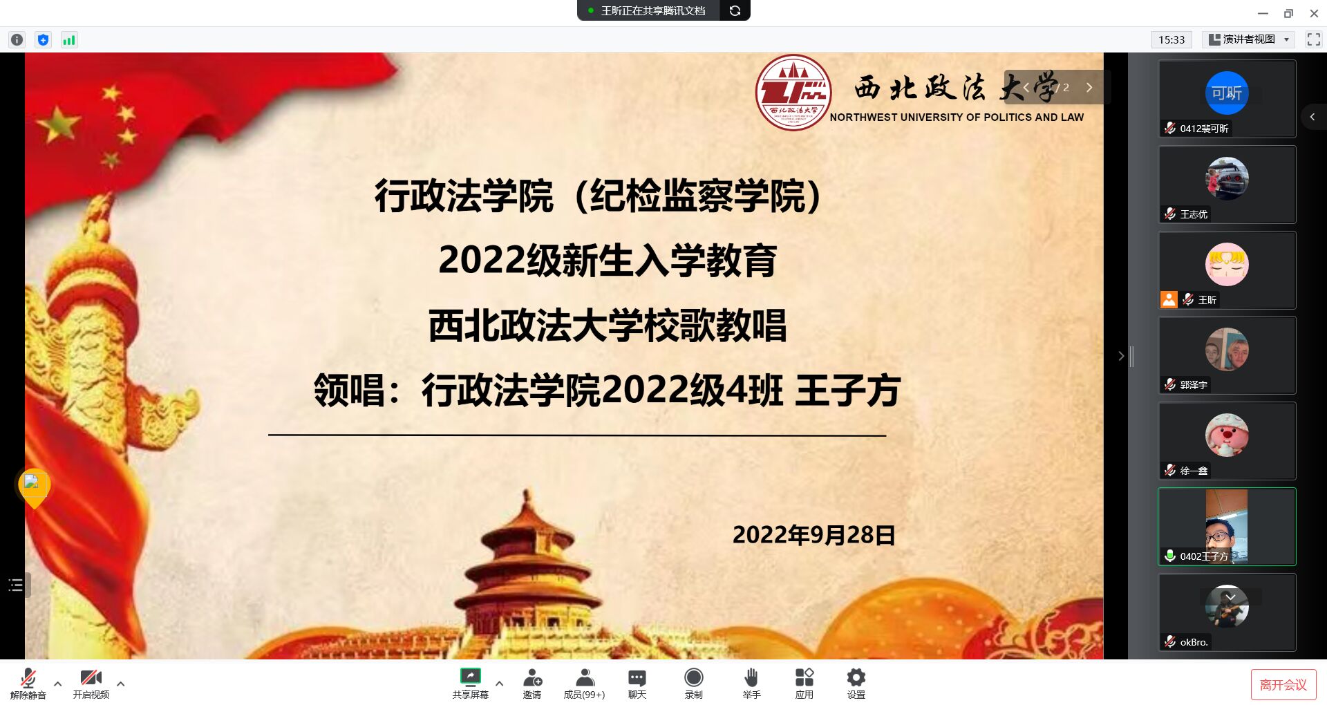 青春学子的鲲鹏之志扬帆起航。窗外桂花十里飘香,屏幕前歌声热烈活跃,唱校歌成为同学们的精神调剂,也是2022级新同学感受西法大之魂的最好媒介。行政法的新同学们脸上洋溢着热意,此刻已成为行政法全体新生共同的集体记忆,他们已成为新的西法大人。