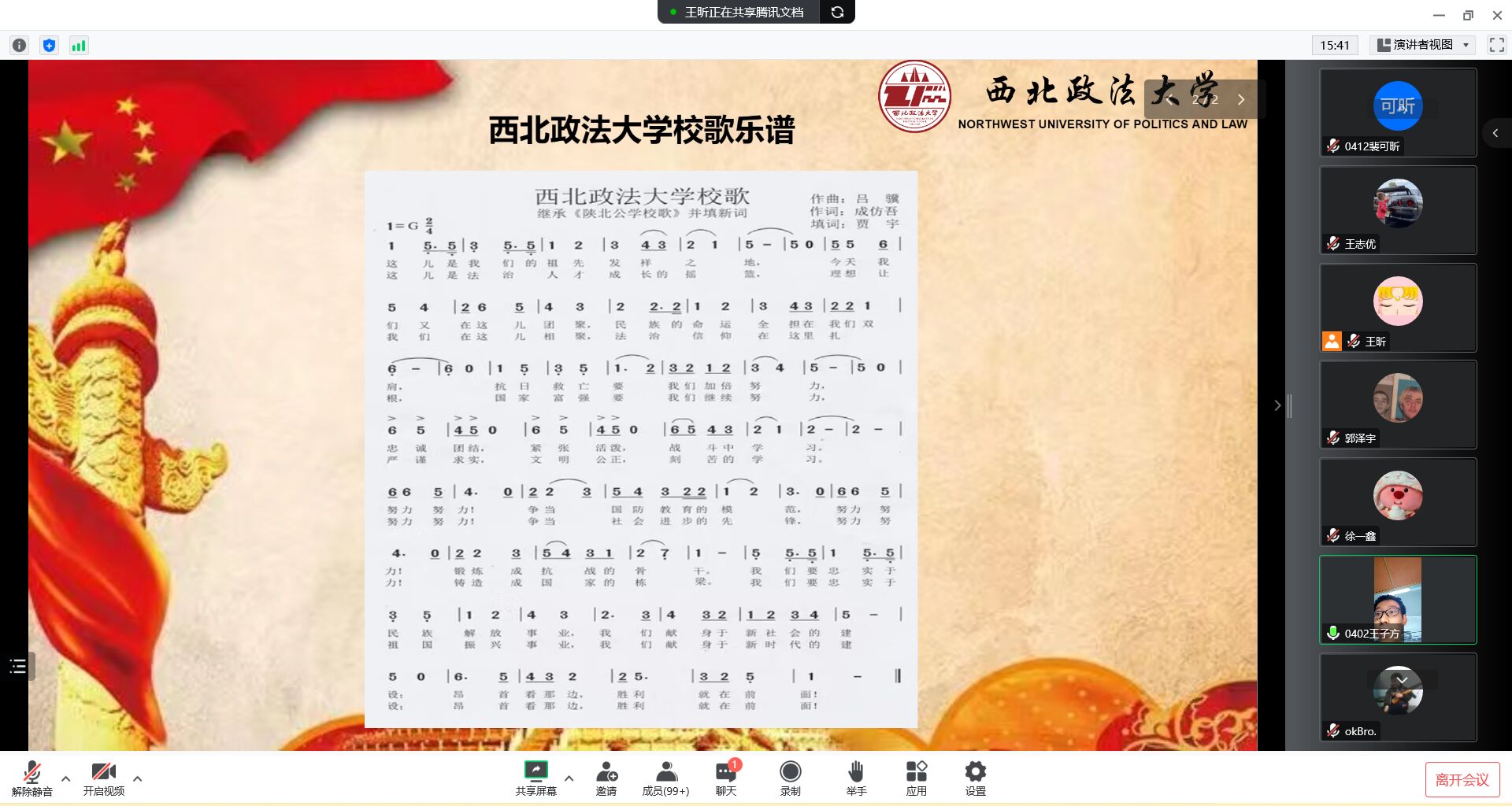 在王子方同学的领唱下,同学们端坐屏幕前认真而专注地聆听着美妙激昂的旋律,歌唱着属于西法大的声音。悠扬的校歌承载着西法大的精神,也包含着历代西法大人的共同情感。抓耳的旋律深入同学们的内心,昂扬的曲调指引着同学们向前。