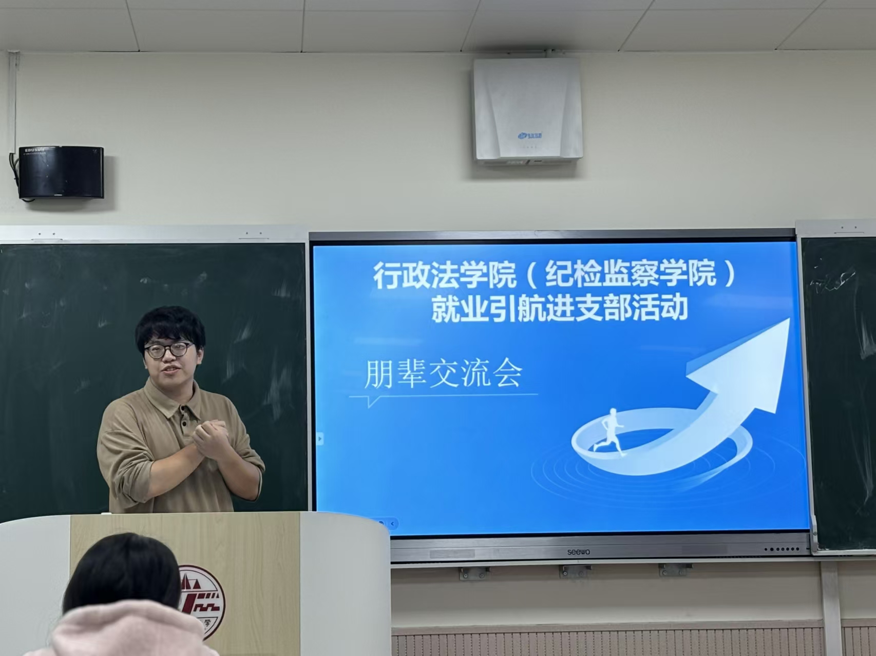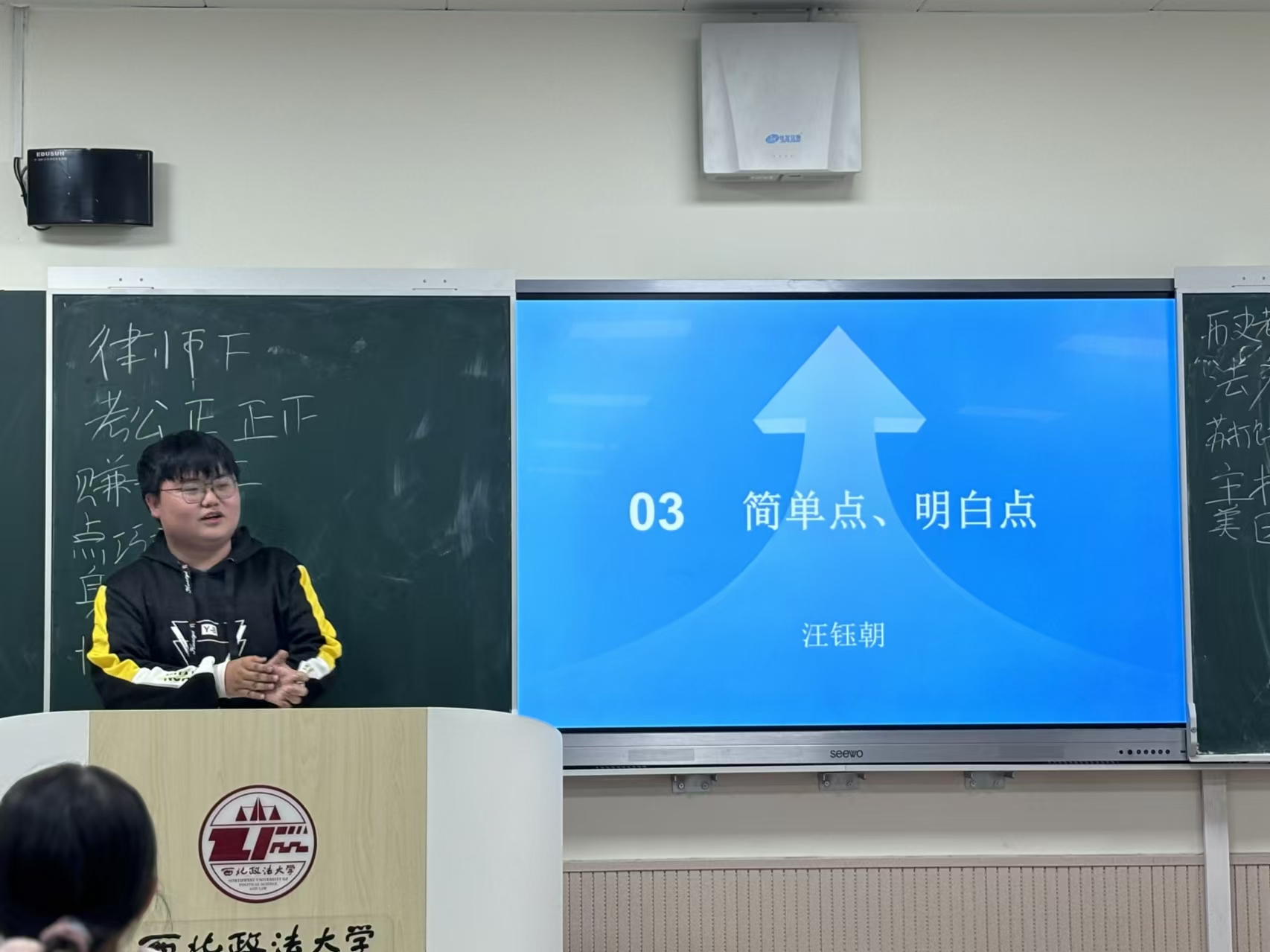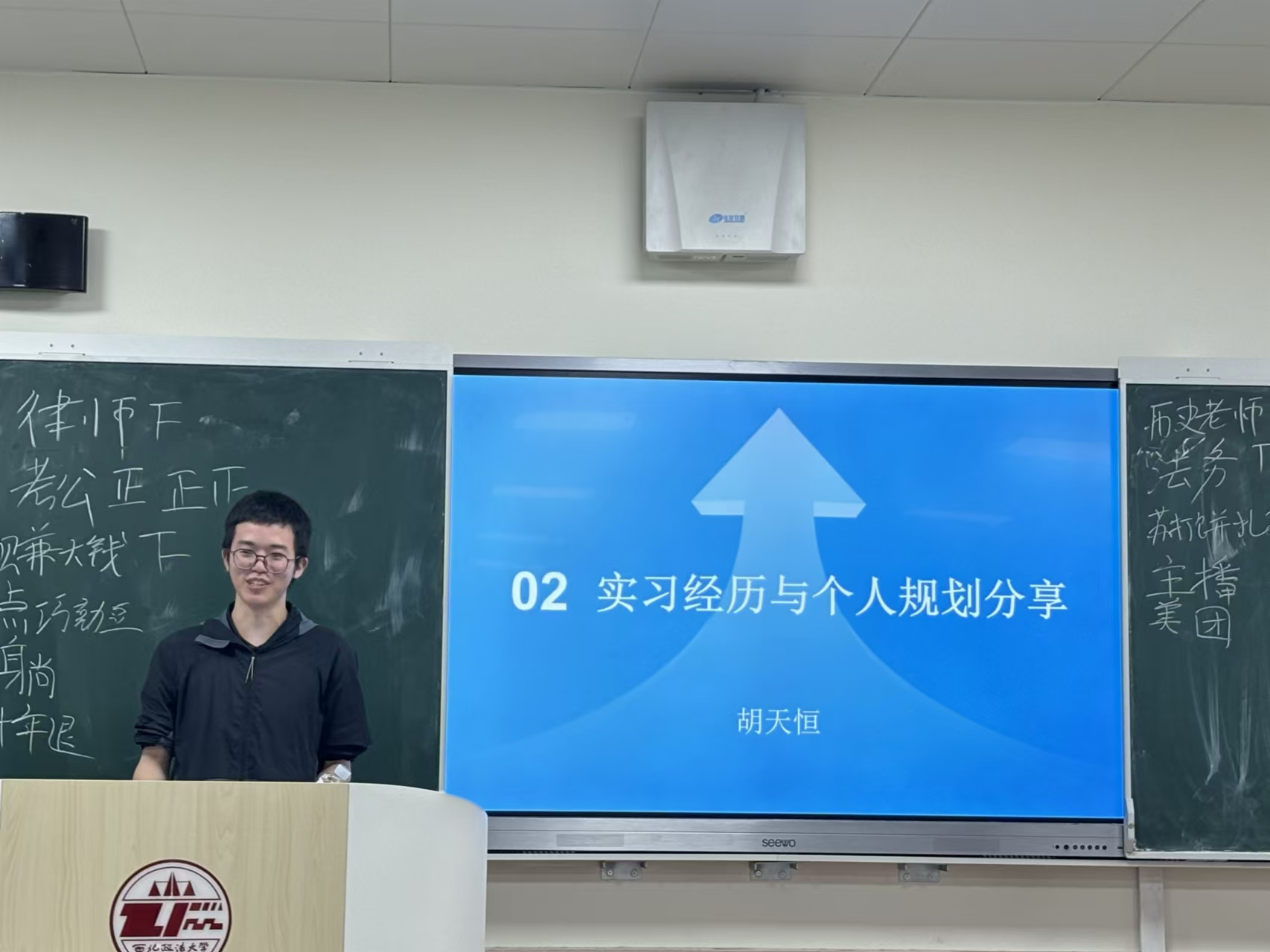 法律援助中心工作的经历出发,为同学们进行了就业指导。接着,胡天恒同学以详实的思维导图与同学们分享了自己的实习经历与个人规划,希望同学们能够对自己的未来有更为清楚的把握。随后,汪钰朝同学以自己在《知行学刊》的编辑工作以及在纪检监察实务部门的实习经历为例,与同学们分享学习与工作经验,为大家提供前行指导。
