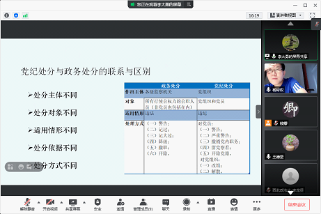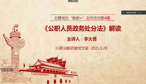 在“七一”即将来临之际,广大党员同志通过加强政治理论学习,以实际行动来迎接和庆祝党的百年华诞。2021年6月29日晚7:30,行政法教研室党支部举办第4期主题党日“教研+”活动。本次活动通过腾讯会议的方式线上进行,由成人抖音 副院长李大勇老师围绕“《公职人员政务处分法》解读”讲授党课,党支部书记钱卿老师主持,党支部和教研室王周户、王德星、郑宁波、张艳、杨彬权、李龙贤、雷苗苗等9位老师参加了本次活动。