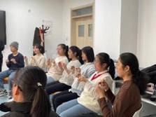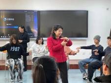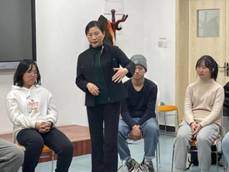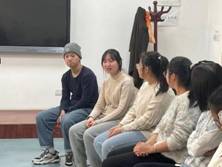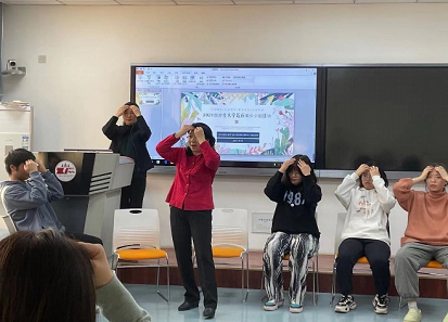 在预热环节,同学们还比较拘谨的,李芳老师与段老师引导大家将厚重的外套脱下,放轻松坐成一圈,双手放在自己的额头上,慢慢下移,将自己的“面具”撕下来,以便更放松地加入到后面的游戏中。