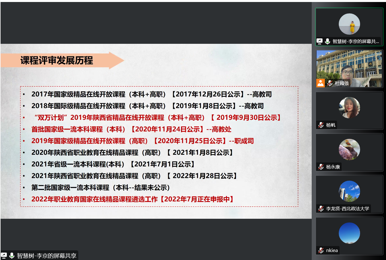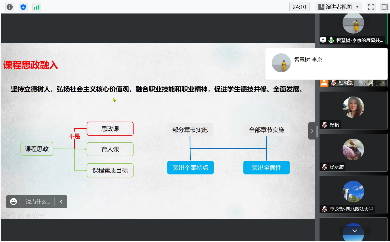 邀请智慧树网李京老师就线上线下混合式一流课程的建设与课程思政进行交流。智慧树网杨帆老师及成人抖音多名教师通过腾讯会议参加了此次线上会议。会议由副院长杜国强老师主持。