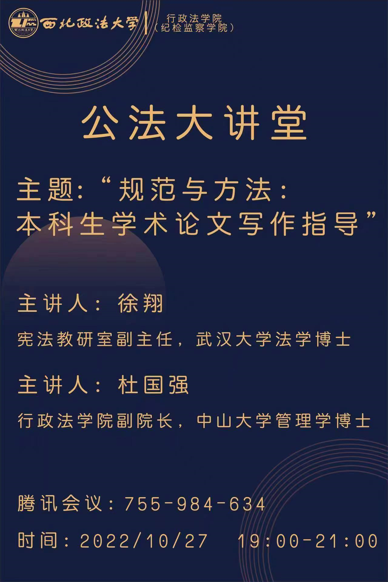 )主办的“公法大讲堂”讲座在线上顺利举行。本次讲座的主题为“规范与方法:本科生学术论文写作指导”。主讲人为成人抖音副院长杜国强老师、宪法教研室副主任徐翔老师。校内外师生100余人通过腾讯会议参加了此次讲座。
