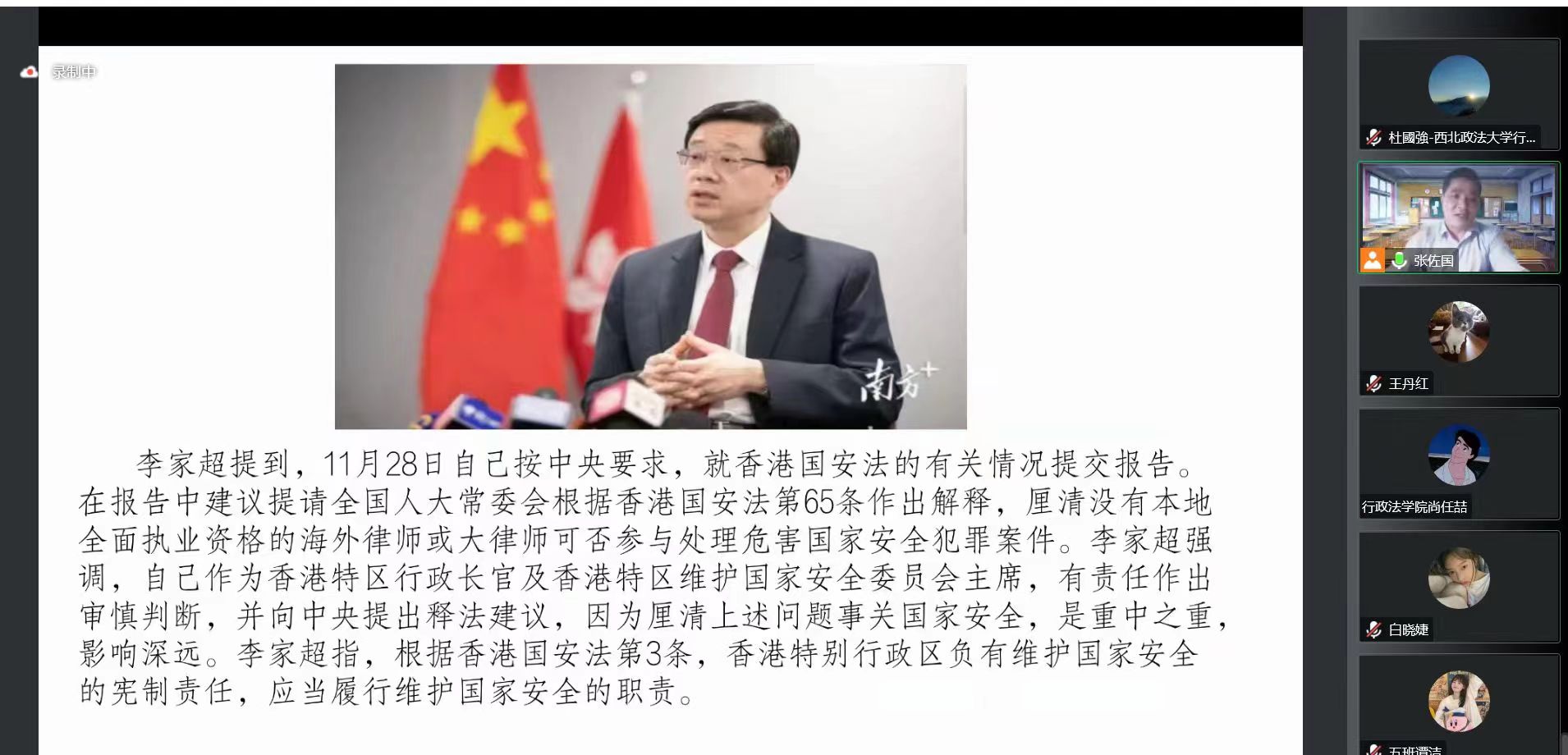 本次公开课由张佐国博士主讲,课程为《港澳基本法》。作为具有强大课程思政渲染力的课程,张佐国老师遵循国家的“一国两制”政策,从学生感兴趣的黎智英案件出发,向学生讲授了香港的司法机构、外籍法官制度、高度自治下的司法审查制度等。