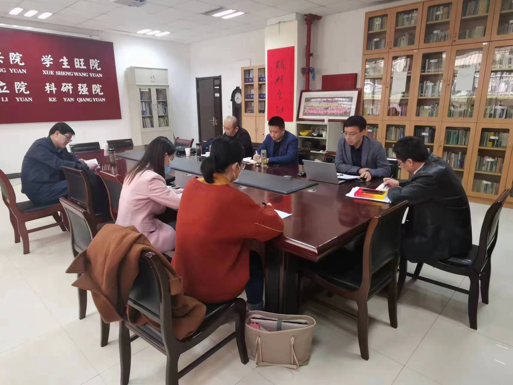 在长安校区四号教学楼资料室召开专题推进会。校教务处处长李大勇教授,正在或者有意实施混合式教学的杜国强老师、钱卿老师、李龙贤老师、杨彬权老师、雷苗苗老师、田依芾老师等人参加会议。会议由杜国强老师主持。