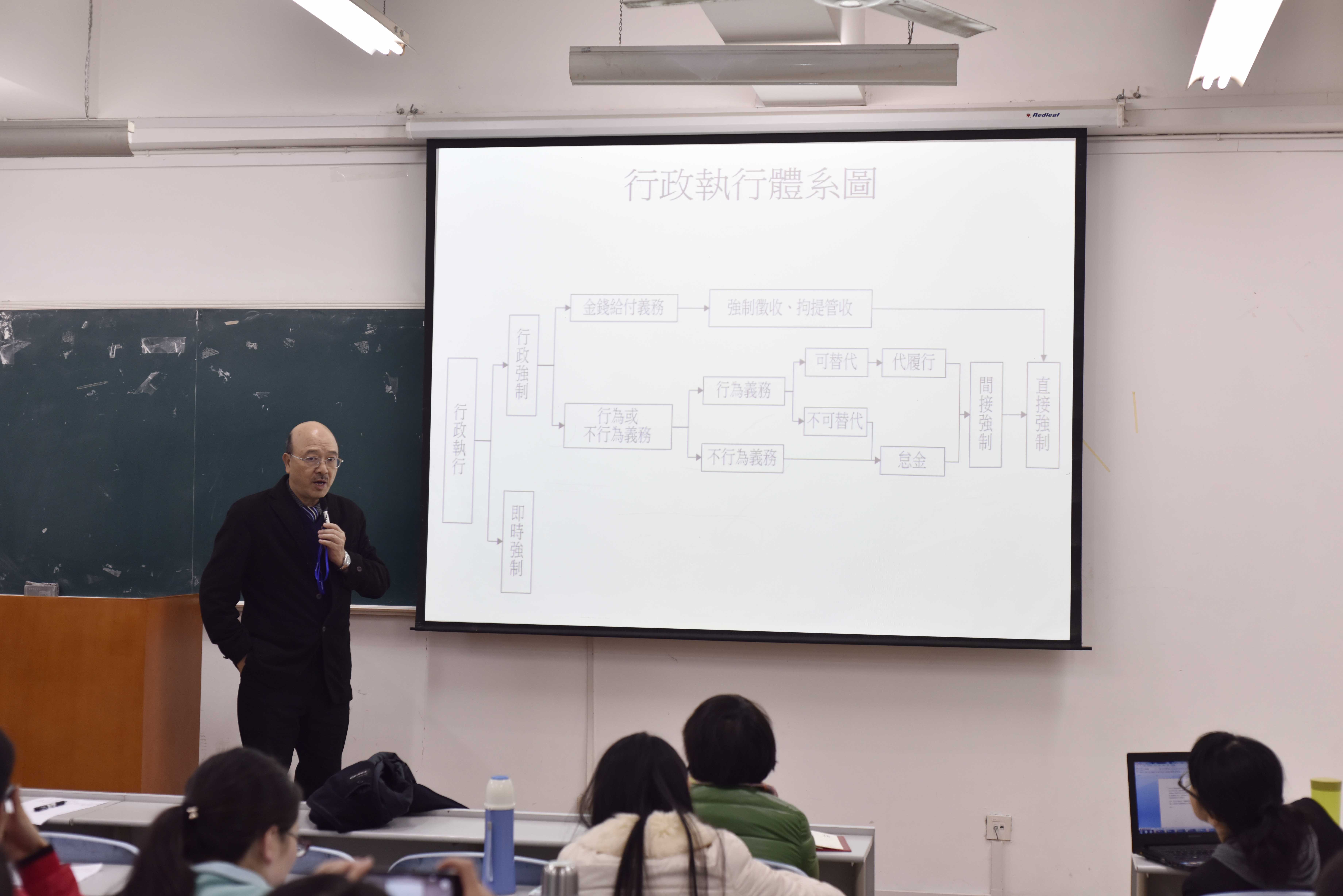 报告会上,蔡教授首先向大家介绍了台湾的行政执行体系,并对台湾行政执行署的工作职责做了简要说明。之后,蔡教授对台湾行政执行中的执行机关、执行时间限制、执行程序等问题进行了讲解,对行政执行过程中遇到的问题进行分析,并将台湾行政执行法与大陆行政执行法进行对比。接下来,蔡教授主要讲解了行政强制执行中的职务协助问题,并对台湾行政执法体系中的“行为与不行为强制执行”、“金钱给付的执行”、“即时强制执行”、“联合稽查”等问题进行一一讲解。同时,蔡教授还向同学们介绍了台湾立法与修改的相关内容。通过这次讲座使同学们对台湾地区的行政执法问题有了更为深入的了解,讲座在同学们的阵阵掌声中结束了。
