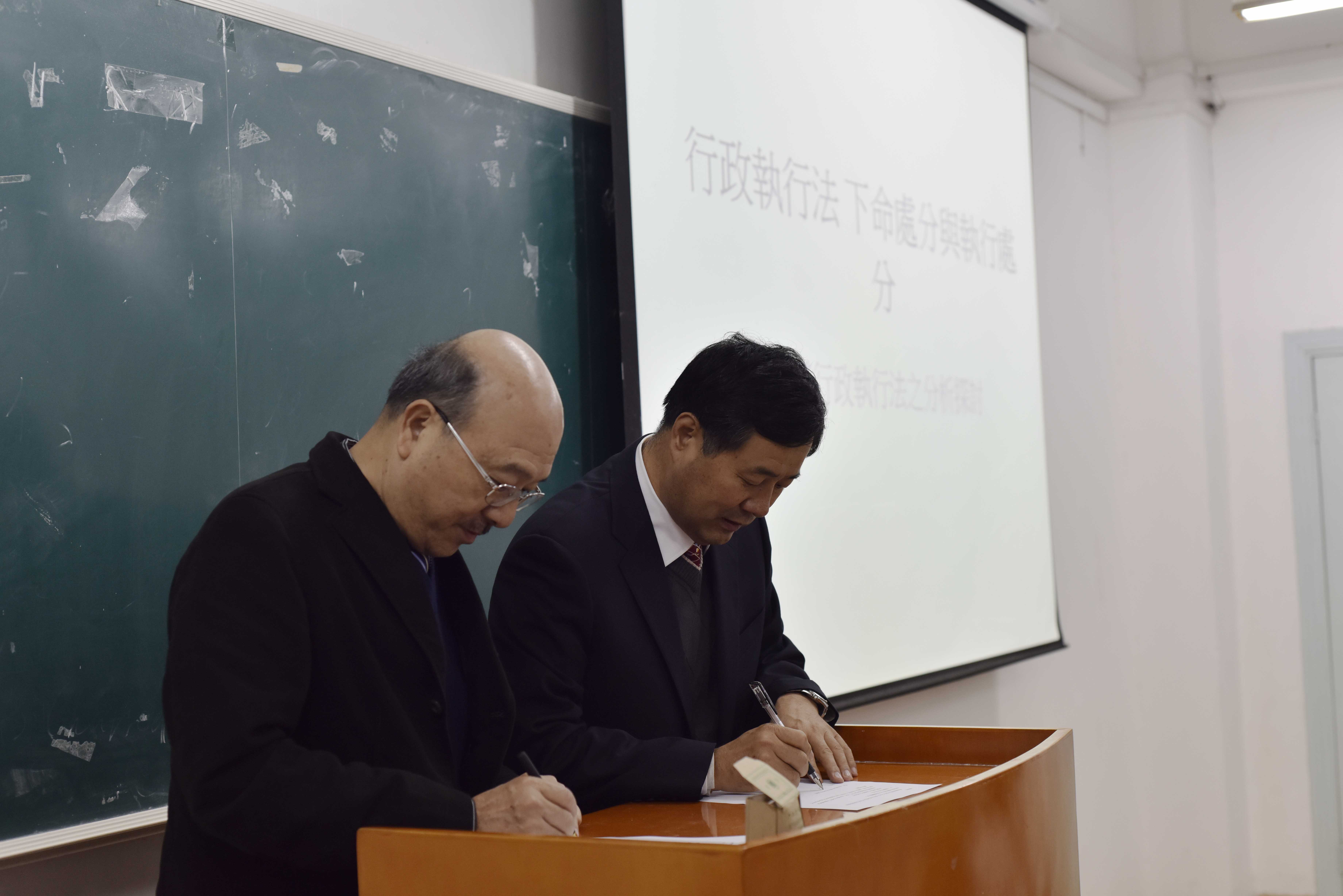 讲座正式开始前,王周户院长与蔡震荣教授就成人抖音 与台湾真理大学财经成人抖音 日后合作签订合作协议。之后讲座正式开始。