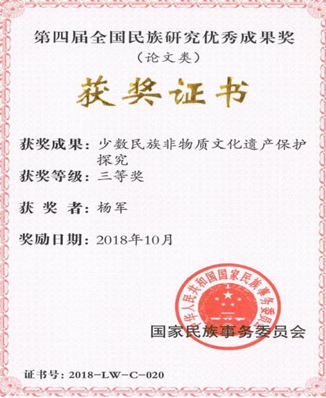 全国民族研究优秀成果奖是我国研究民族问题的权威奖项,由国家民族事务委员会组织评选,之前分别于2010年、2012年、2015年各评一次。本次全国民族研究优秀成果奖经初核、初审、复审、核查、终审和公示,共评出优秀成果奖著作类71部、论文类72篇。其中,著作类一等奖9部、二等奖20部、三等奖42部;论文类一等奖8篇、二等奖20篇、三等奖44篇。