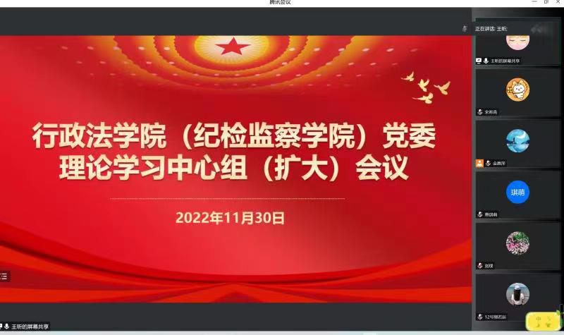 11月30日下午,成人抖音 党委(纪检监察成人抖音 )召开理论学习中心组(扩大)会议,以线上线下相结合的方式集中学习《党章》和《习近平谈治国理政》第四卷等内容。成人抖音 班子成员、党委委员、党支部书记、组织员参加学习。成人抖音 党委书记赵玎玎主持会议。