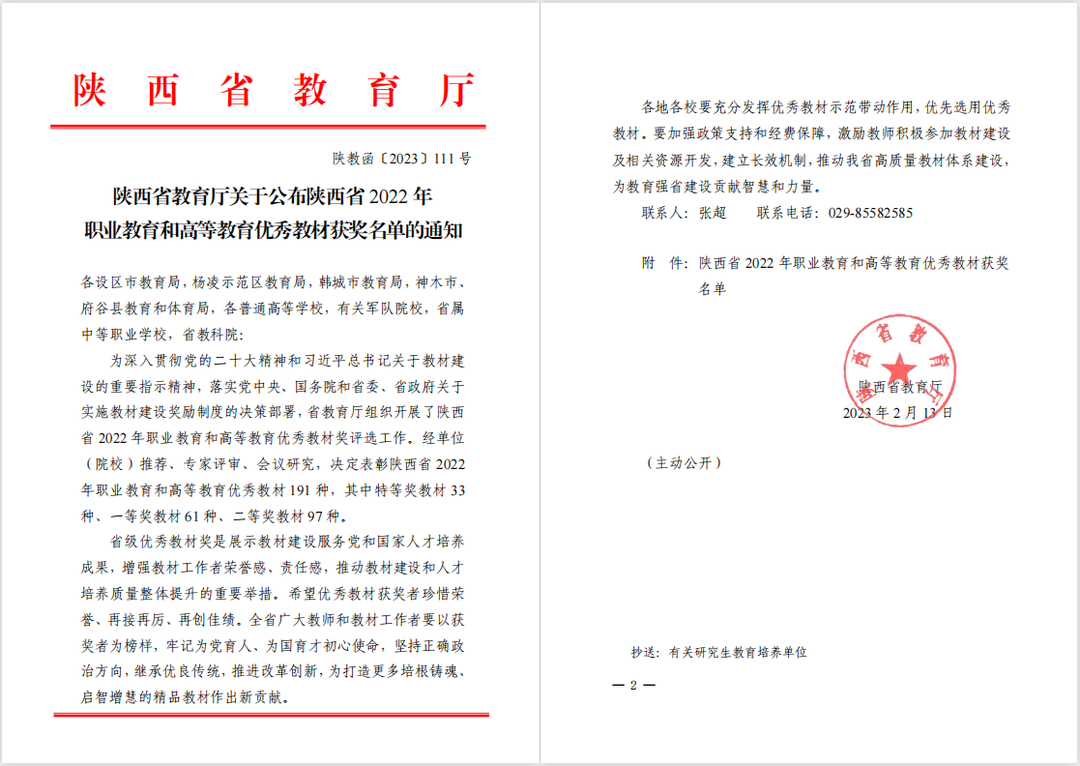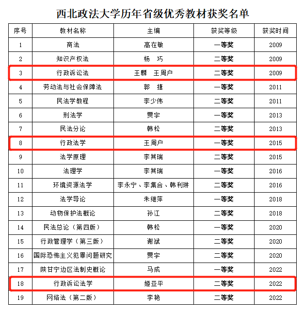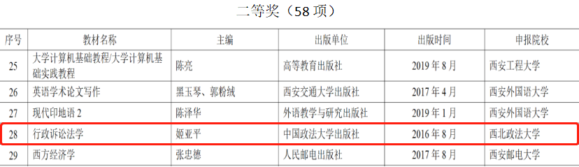 近日,陕西省教育厅印发《关于公布陕西省2022年职业教育和高等教育优秀教材获奖名单的通知》(陕教函〔2023〕111号),成人抖音姬亚平教授主编的《行政诉讼法学》荣获本科教育类二等奖,获奖详细信息见下:
