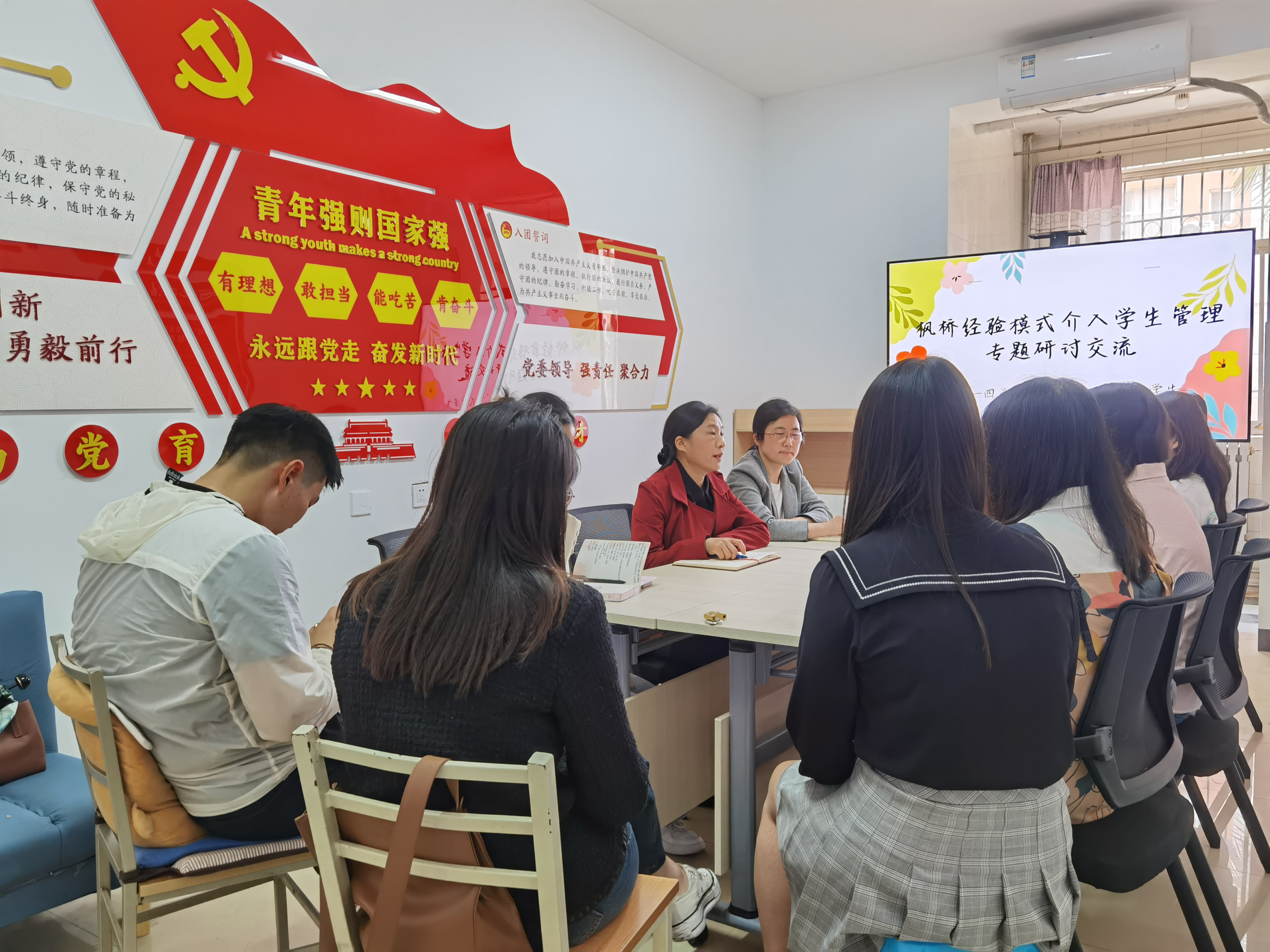 4月18日下午17点,成人抖音 党政领导深入四号学生公寓,召开枫桥经验模式介入学生管理专题研讨交流会,会议由成人抖音 2019级辅导员徐泽蓉主持,成人抖音 党委书记赵玎玎、党委副书记李芳、2021级辅导员周磊磊、2022级辅导员王昕以及宿舍楼学生代表参会。