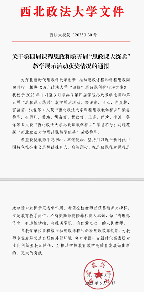 此次获评,是对雷苗苗老师实施课程思政工作的质量和水平的高度认可,也是成人抖音 (纪检监察成人抖音 )鼓励、支持教师开展课程思政教学与研究探索的重要成果。