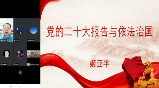 姬亚平以《党的二十大报告与依法治国》为题,系统回顾了党的十八大以来深入推进社会主义法治国家建设取得的历史性成就,全面解读党的二十大报告中坚持全面依法治国,推进法治中国建设的战略部署,并提出成人抖音 作为公法特色鲜明的法成人抖音 ,全体教师要紧紧围绕党的二十大精神,扎实推进人才培养、学科建设和科研工作高质量发展。