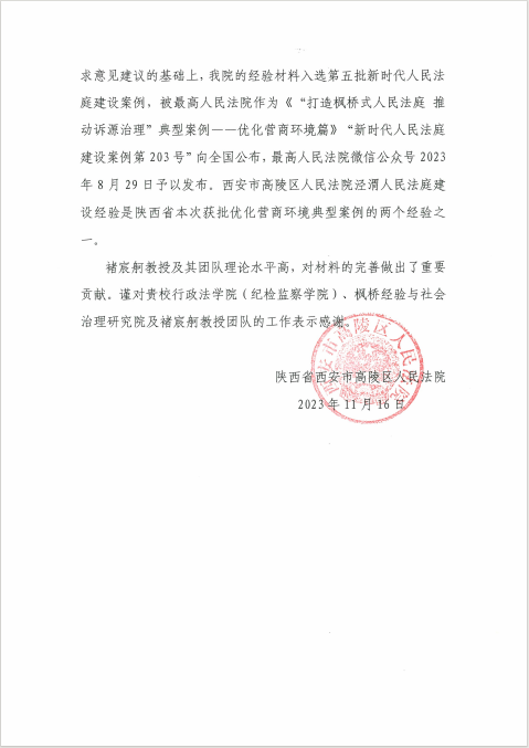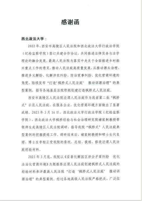 近日,西安市高陵区人民法院致函学校,对成人抖音褚宸舸教授团队为“枫桥式”人民法庭典型案例的总结提炼工作作出的重要贡献表示感谢。