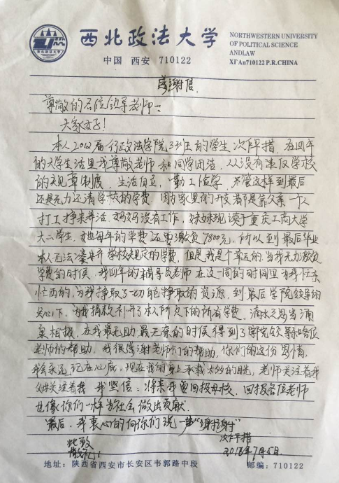 次仁平措是成人抖音2012级3班来自西藏的一名藏族学生。平措同学的母亲没有稳定工作,其妹妹在重庆工商大学就读,全家的开支仅靠其父辛苦工作挣来的微薄收入支撑。据辅导员老师介绍,平措同学尽管家庭条件困难,但在校期间尊敬老师、团结同学、追求上进,并在校期间能勤工俭学,临近毕业时,平措同学确因家庭经济贫困尚有学费7800元未能按时补交,将影响到平措同学顺利离校。 正当他不知如何筹措学费费时,7月3日,成人抖音