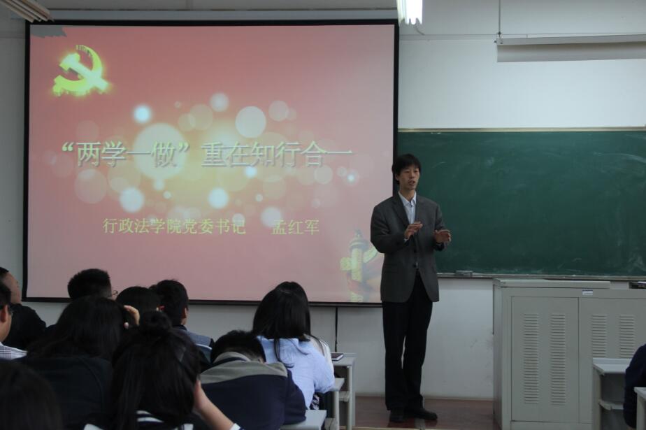 他首先讲述了“两学一做”学习教育的背景及重要意义、学习的目的和具体要求、采取的主要形式及有效措施。他进一步强调开展“两学一做”学习教育,基础在学,关键在做,“学”要带着问题学,“做”要针对问题改,要坚持从实际出发,学用结合,知行合一。他讲到党章是一部活着的历史,承载了一代代共产党人的历史记忆,记录着党的思想、理论和政治路线与时俱进的发展轨迹,再现了我们党从稚嫩走向成熟的全过程;党章是一把刻度清晰的标尺,是全党必须遵循的总规矩,对于党员来说,应当牢牢记在心里、握在手中,时常拿出来仔细比对,看看言行符不符合规定,有没有把在党言党、在党忧党、在党为党的要求落实到位;锤炼党性是一辈子的功课,记住党章的条目不难,做一时合格党员也不难,难的是把锤炼党性作为一辈子的功课,始终保持共产党人的铮铮铁骨。他同时和学生们分享了自己学习党章党规和系列讲话的心得体会以及对于做合格党员的认识,鼓励大家以党章党规作为基本标准和行为规范,用系列讲话加强自身理论武装,以知促行,以行践知,做“四讲四有”的合格党员。