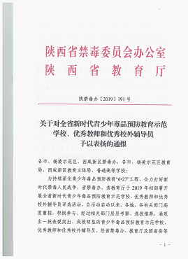 根据陕禁毒办(2019)191号文件,在本次评选活动中,成人抖音 获得“全省新时代青少年毒品预防教育示范学校”,成人抖音 (纪检监察成人抖音 )教师褚宸舸、李芳获得“全省新时代青少年毒品预防教育优秀教师”。希望2位教师珍惜荣誉,再接再厉,发挥示范引领作用,继续深入做好青少年毒品预防教育工作。
