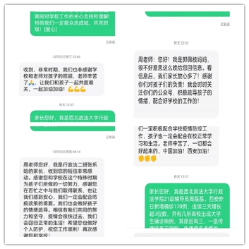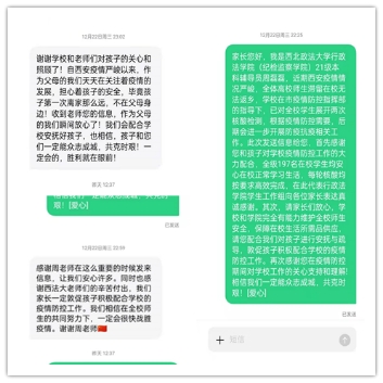 西安此次新冠疫情不仅牵动着全体师生的心,更牵动着来自五湖四海同学们家人的心。为抚慰家长的担忧与焦虑,成人抖音辅导员老师为学生的父母一一发送短信,并通过公众号推送向家长展示学生在校学习生活,与学生们保持在同一战线,家长们纷纷表示理解与支持,送来一句句的暖心话语,感谢学校与老师们为同学们的辛勤付出,并积极配合学校的防疫工作,与同学们积极沟通及时安抚疏导。家长的充分理解给予了同学们精神上的支持,更给予了我们战胜疫情的信心!