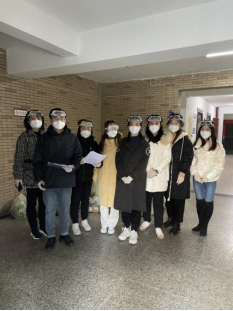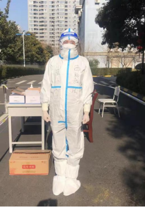 崔小宜老师每日主要参与蔬菜、大米、馒头等物资的配送,协助医护人员核酸检测、信息统计、巡逻值班、维持秩序等工作。在和崔小宜老师的交流中了解到,她主动申请给核酸检测医护人员当助手,最长一次工作时间达6小时,最细小的环节,承担着最大的风险,传递着最有力的温情。由于每做一次核酸就要消毒一次,加之天气严寒,她感受到了医护人员的艰辛与不易。崔小宜老师说:“穿上那身白色的防护服,就要承担起责任。”