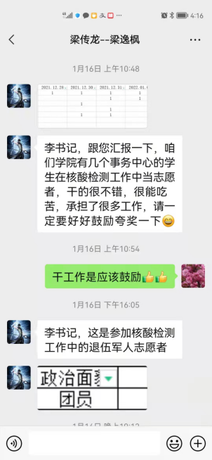 在疫情防控期间,成人抖音退伍军人张自翔以及钟珺文、薛开胜、杨倩、王奕菲、黄梦瑶、王玉茜、王苗、史晓雅等学生,积极参与到学校的疫情防控之中,协助学校的核酸检测,网络宣传等工作,在工作过程中学生们吃苦耐劳、积极肯干,受到了学生处的肯定和表扬。