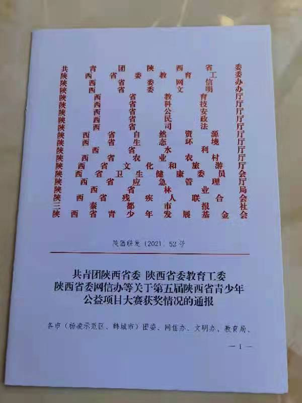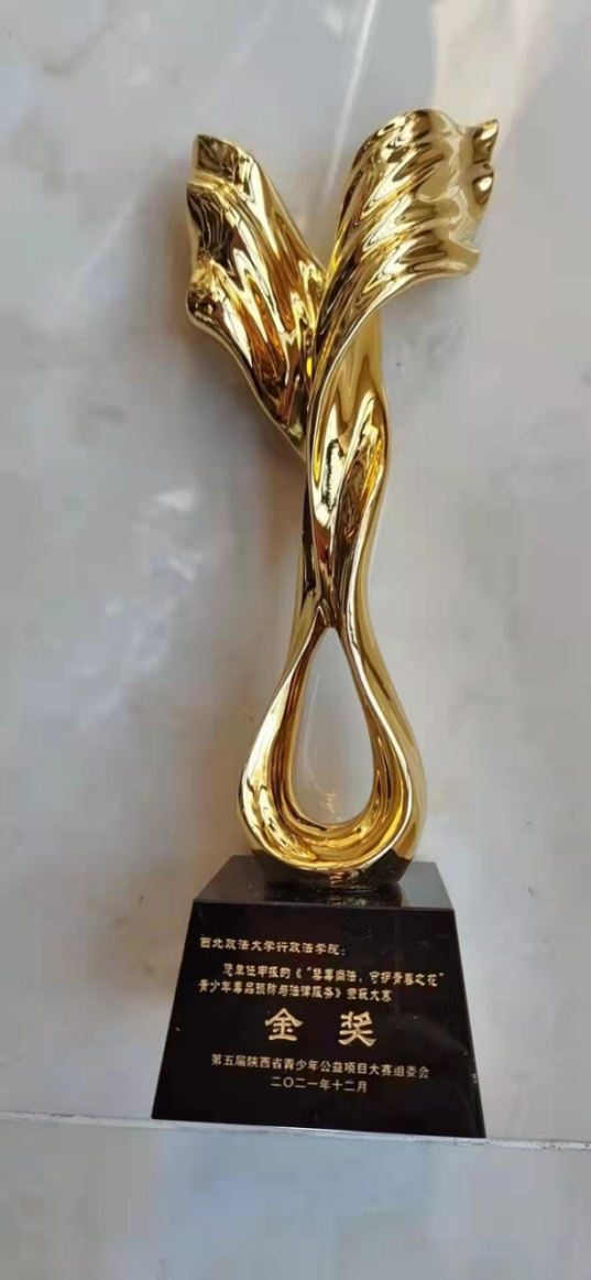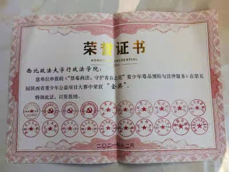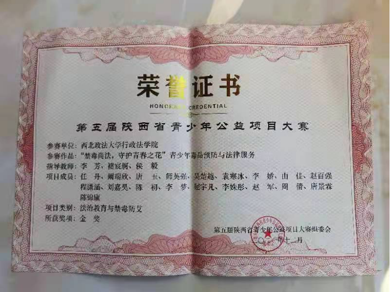 申报的公益禁毒普法宣传项目——“禁毒尚法、守护青春之花---青少年毒品预防与法律服务”项目,荣获第五届陕西省青少年公益项目大赛金奖。