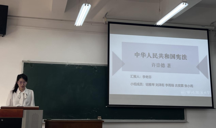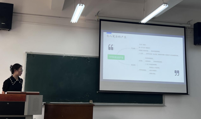 李奇芬同学以我国经济制度为视角,探讨从五四宪法到八二宪法的经济制度的不断完善、立法修法思想的更新与社会的发展演变,根据《中华人民共和国宪法史》中就我国经济制度的梳理,该小组同学总结:1988年宪法为改革开放深入发展提供“根本”保障、1993年宪法向社会主义市场经济进军,进行了历史性的突破、1999年宪法为中国跨世纪的发展指引前进的方向、2004年宪法更加关注人民群众的切身利益。李奇芬同学的分享让同学们深刻感受到修宪工作使宪法更好地保障广大人民群众的根本利益,促进经济发展和社会全面进步,助力我国社会主义现代化建设。